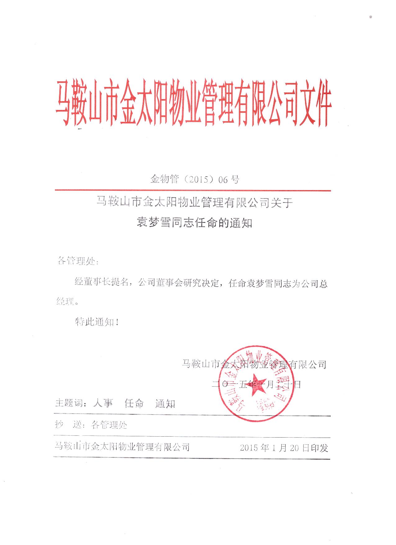 2015年1月21日,公司召開(kāi)高層管理人員會(huì )議,公司董事長(cháng)朱曉梅同志宣布袁夢(mèng)雪總經(jīng)理正式上任。