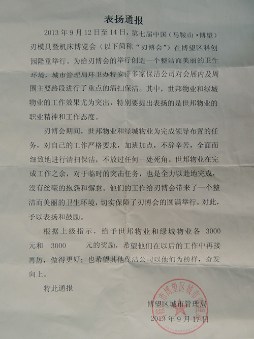 綠城勞務(wù)服務(wù)公司獲博望區城市管理局表?yè)P通報