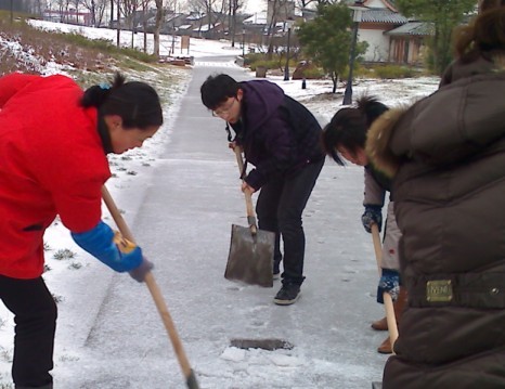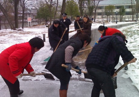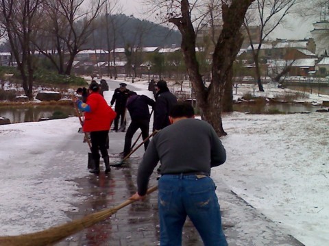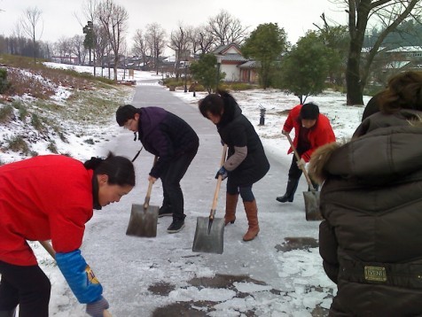 雖然每當大雪覆蓋,公司也有嚴明的經(jīng)律,各管理處必須第一時間將所在管理處的門前和通道清理干凈,各管理處還是在完成好自己職責的情況下抽調(diào)精兵強將,保證重點、全力以赴。公司在短短的2 個小時時間里調(diào)集23名員工,下午1點及時趕赴采石風景區(qū)翠螺灣。在細雨薄霧中,經(jīng)過4 個小時的緊張戰(zhàn)斗,3000多米的游道終于掀起神秘的面紗,一條清晰的道路展現(xiàn)出來!受到風景區(qū)領導的一致好評!