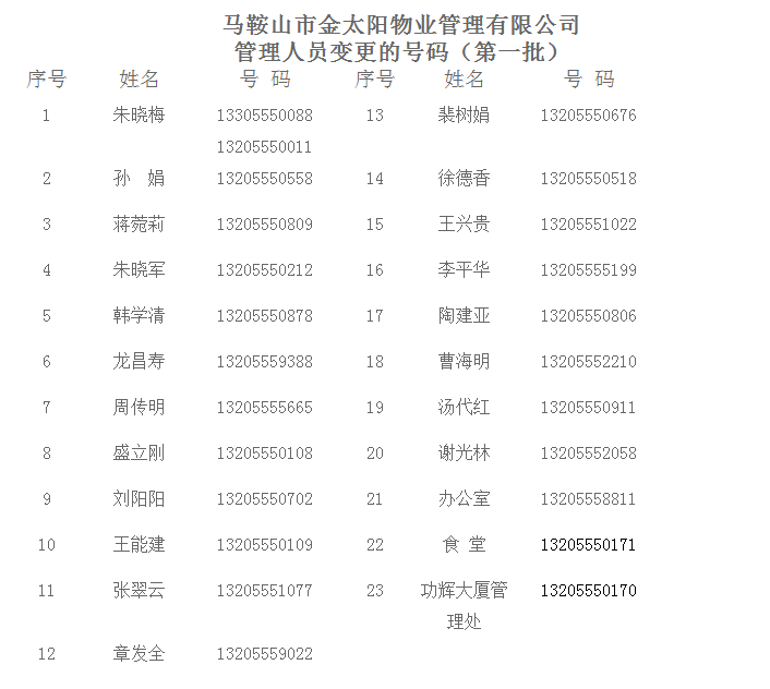 近日,我公司對(duì)管理人員聯(lián)系電話進(jìn)行了更新,小號(hào)使用6位數(shù),88+后6位數(shù)。原來使用的聯(lián)通號(hào)碼不變,原使用的電信號(hào)碼保持到年底。特此通知。