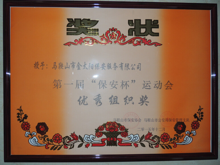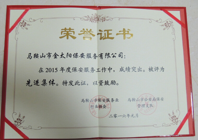 會上,我金太陽保安服務公司總經(jīng)理朱曉軍代表2015年度保安服務業(yè)先進集體上臺發(fā)言。會議中強調,保安工作是平凡而艱苦的,既然我們選擇了保安工作,就深知,干一行,愛一行,專一行的道理。嚴格把關保安持證上崗,我公司員工會齊心協(xié)力把保安工作做好,不辜負領導對我們殷切的希望。此次我公司受到的先進集體的表彰和先進個人榮譽證書。