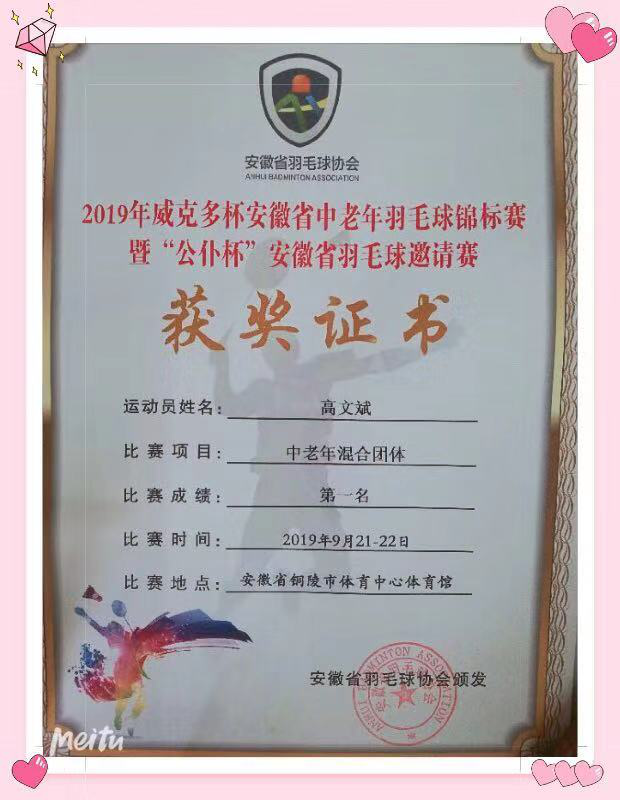 日前,從安徽省羽毛球協(xié)會傳來喜訊,我公司職工高文斌榮獲2019年“威克多杯”安徽省中老年羽毛球錦標賽暨全省“公仆杯”羽毛球邀請賽中,奮力拼搏,奪得“中老年混合團體第一名”桂冠。