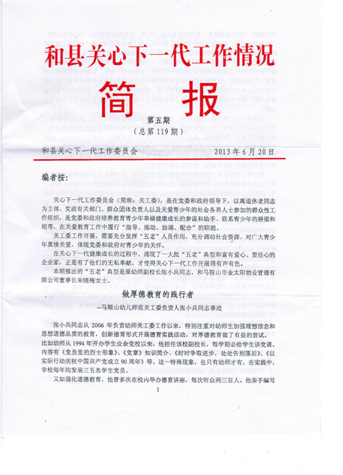 在《和縣關(guān)心下一代工作情況簡(jiǎn)報(bào)》第五期中報(bào)道了公司董事長(zhǎng)朱曉梅資助兩名困難學(xué)生的愛(ài)心善舉。 簡(jiǎn)報(bào)中寫(xiě)道: 4月17日,馬鞍山市金太陽(yáng)物業(yè)…