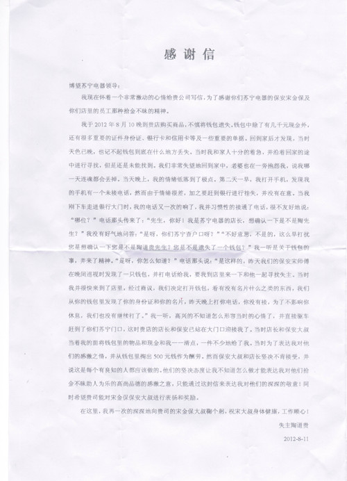 這是一封來(lái)自金太陽(yáng)博望蘇寧電器管理處的感謝信,管理處保安宋師傅夜間巡邏時(shí)發(fā)現(xiàn)一只錢包,其中有幾千元現(xiàn)金和很多重要證件。宋師傅及時(shí)聯(lián)系該蘇寧電器…
