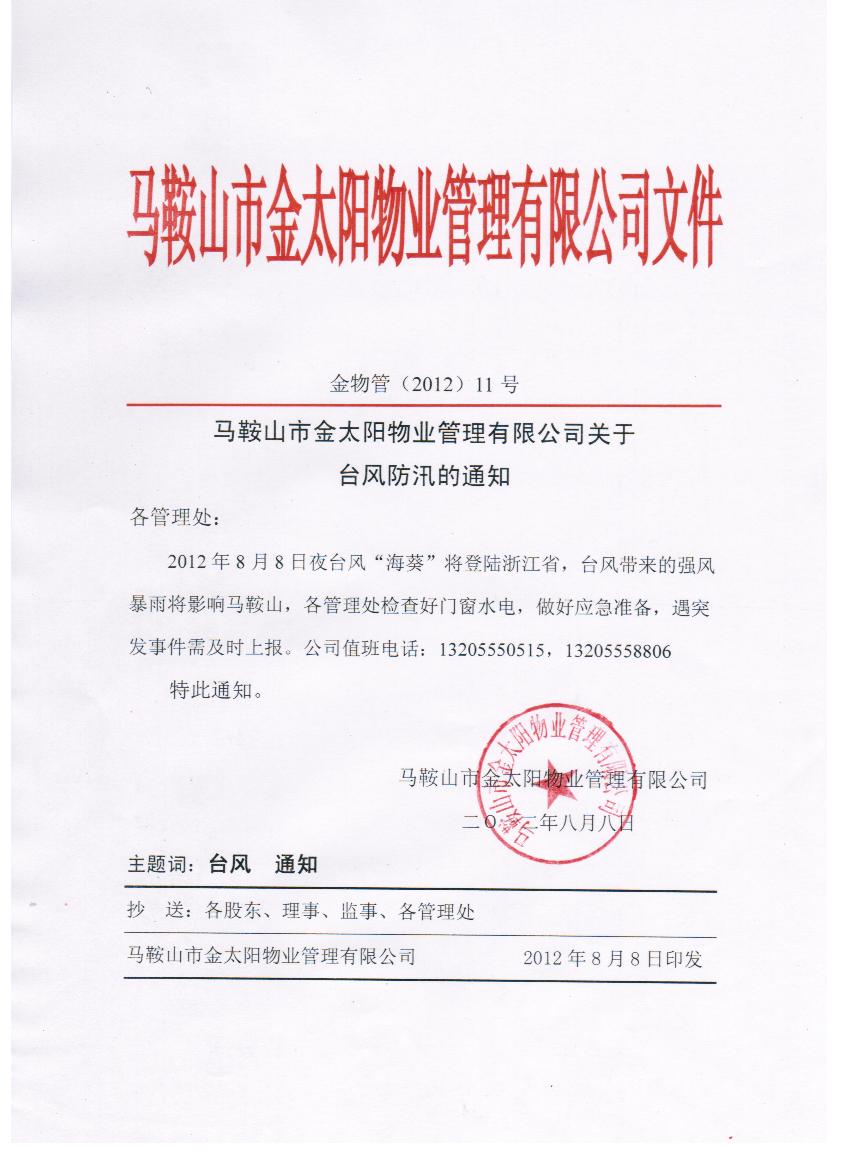 關(guān)于金太陽(yáng)物業(yè)管理有限公司防汛工作通報(bào) 各管理處: 2012年8月8日夜,臺(tái)風(fēng)“??眮?lái)襲,各管理處遭到不同程度的破壞,現(xiàn)將通報(bào)如下: 1、聯(lián)通大…